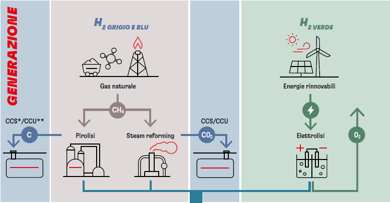 - L’idrogeno verde, la variante più sostenibile, perchè la produzione avviene senza generare emissioni, viene generato tramite elettrolisi dell’acqua mediante fonti energetiche rinnovabili, con un processo che non produce emissioni di carbonio.